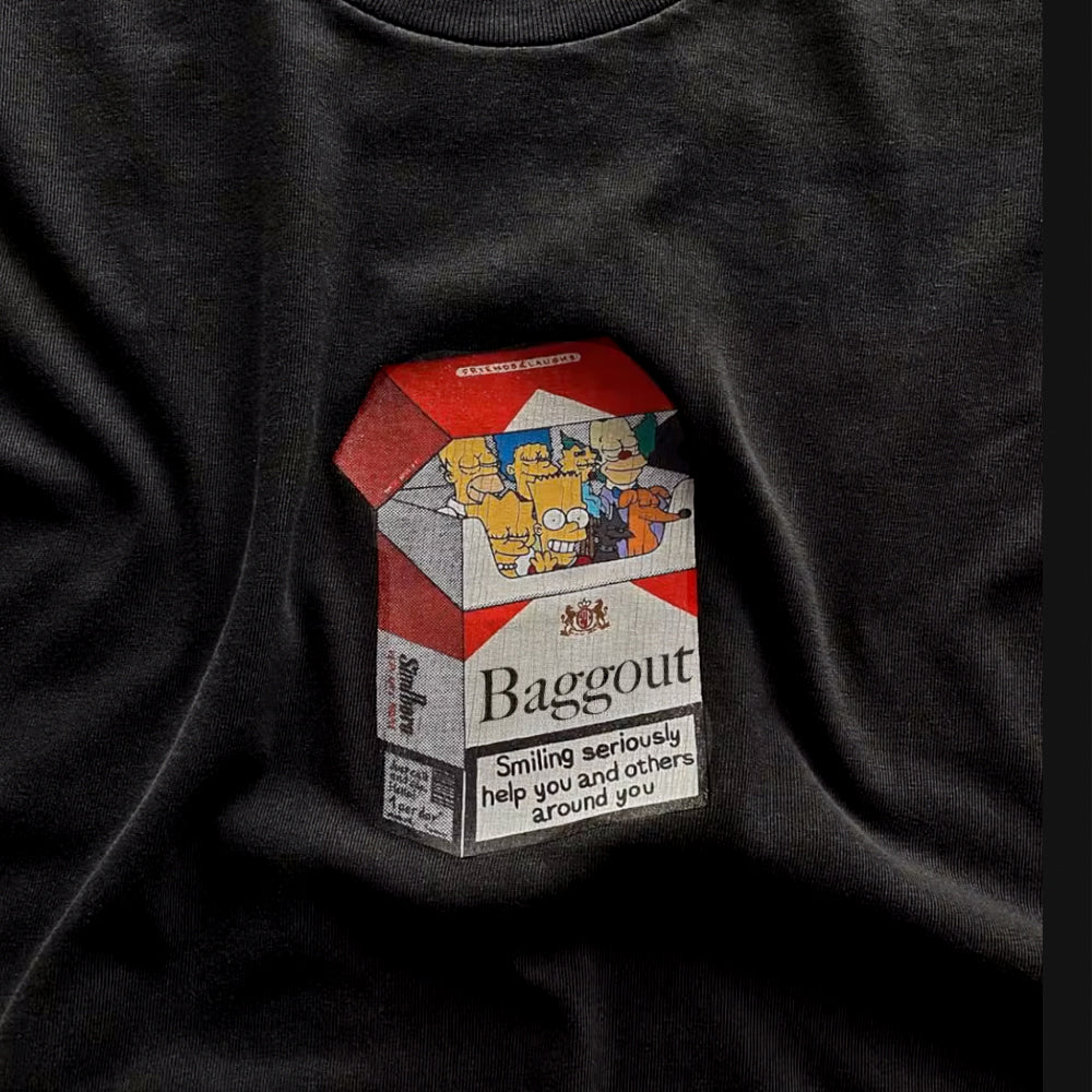Express your unique style with the BAGGOUT Cartoon Cigarette Box T-Shirt. This distinctive apparel features a creative cigarette box graphic design that makes a bold fashion statement. Crafted with quality materials for comfort and durability, it's perfect for casual outings or making an impression in street-style settings. The contemporary design offers versatility for various styling options.