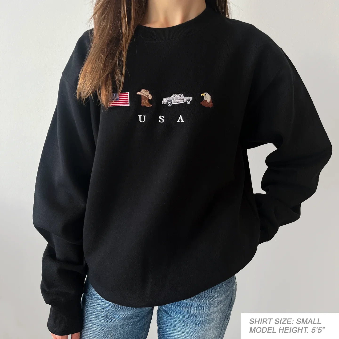 Show off your Americana pride with this cozy Embroidered Sweatshirt featuring USA Icons — a bold yet minimal nod to classic American culture. This clean black crewneck is stitched with four timeless symbols:
