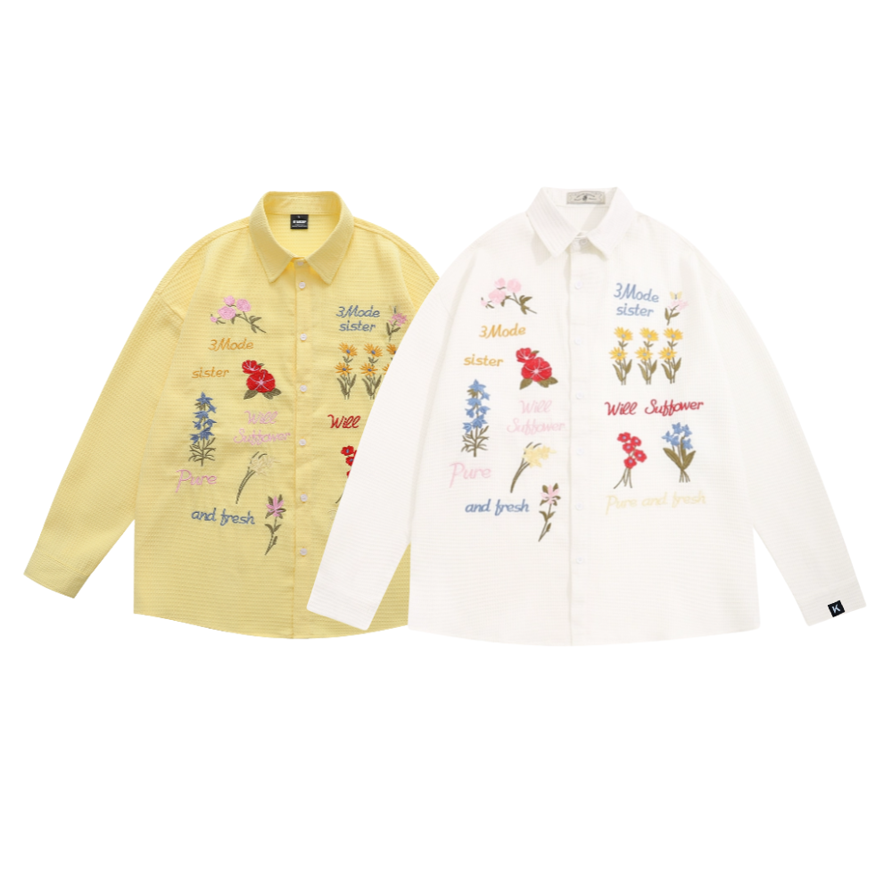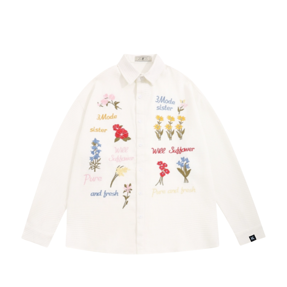 Retro Waffle Colored Floral Embroidered Longsleeve Shirt